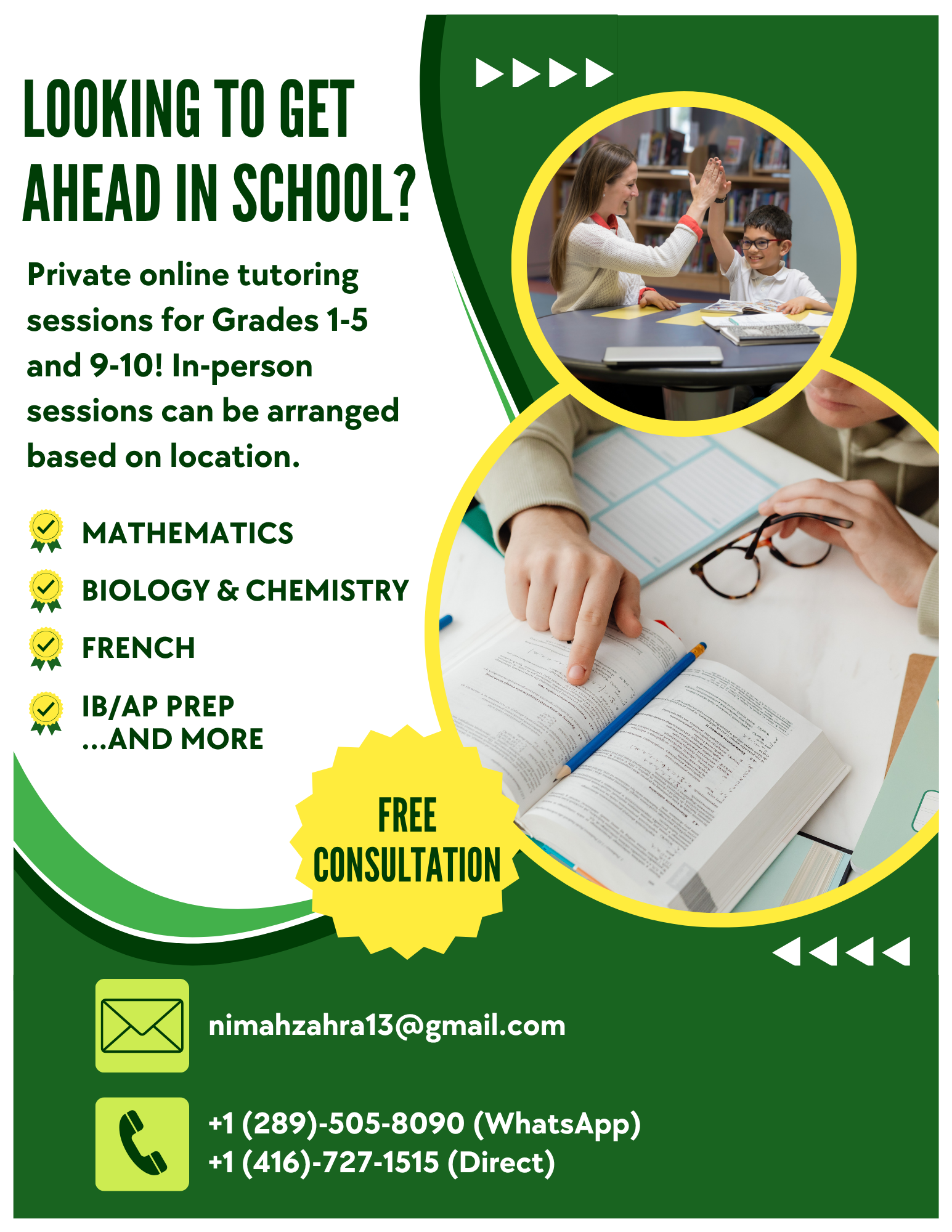 Recently, I have also opened my services to Grade 9 and 10 students for Introduction to Functions, Biology, Chemistry, and likewise because I know how hard it can be to grasp these large concepts within a few weeks. I want to ensure every one of my clients have a strong foundation by the end of our time together so they can soar to their own levels of success.