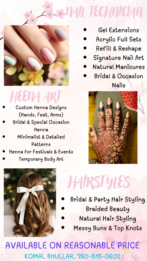 As a Heena, hair, and nail artist, I provide clients with creative and professional beauty services designing beautiful Heena patterns, styling hair for different occasions, and creating stylish nail art to enhance their look.